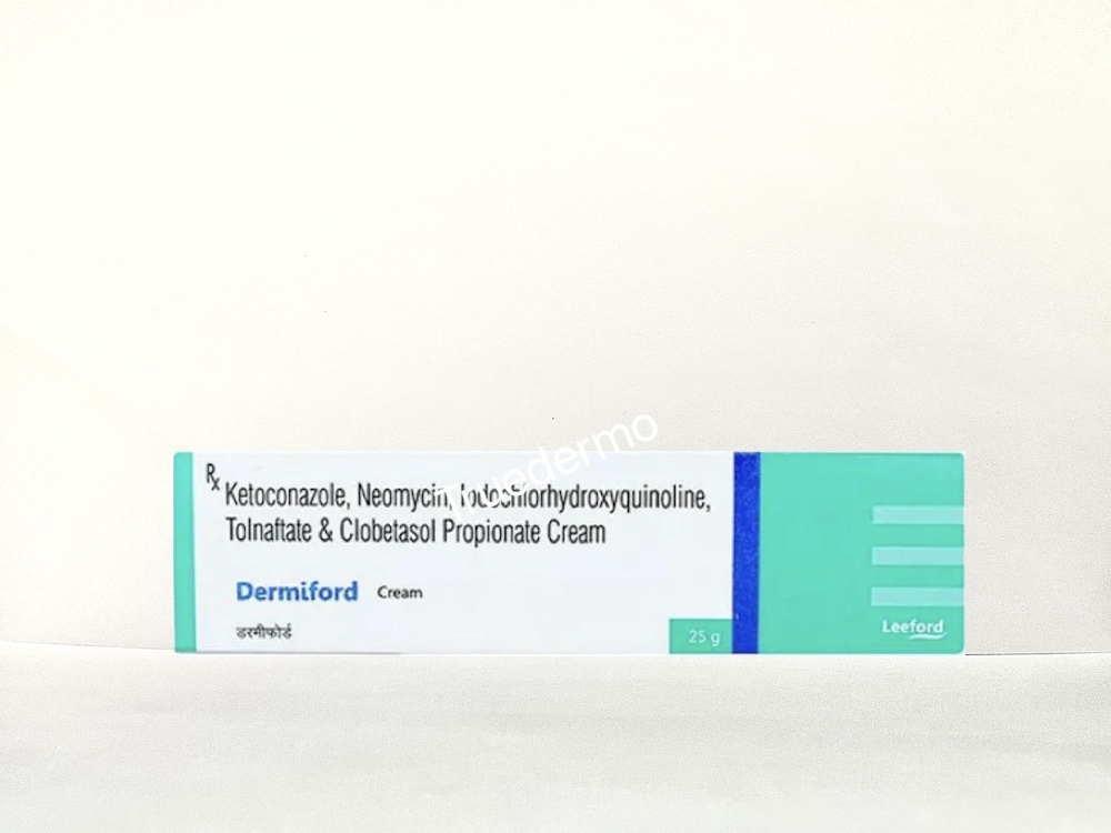 Dermiford is a combinational antifungal and anti-inflammatory cream used for mixed fungal skin infections with severe itching, redness. It combines Ketoconazole, Clobetasol, Clioquinol, Clobetasol and Tolnaftate for their antifungal, antibacterial, and corticosteroid actions.